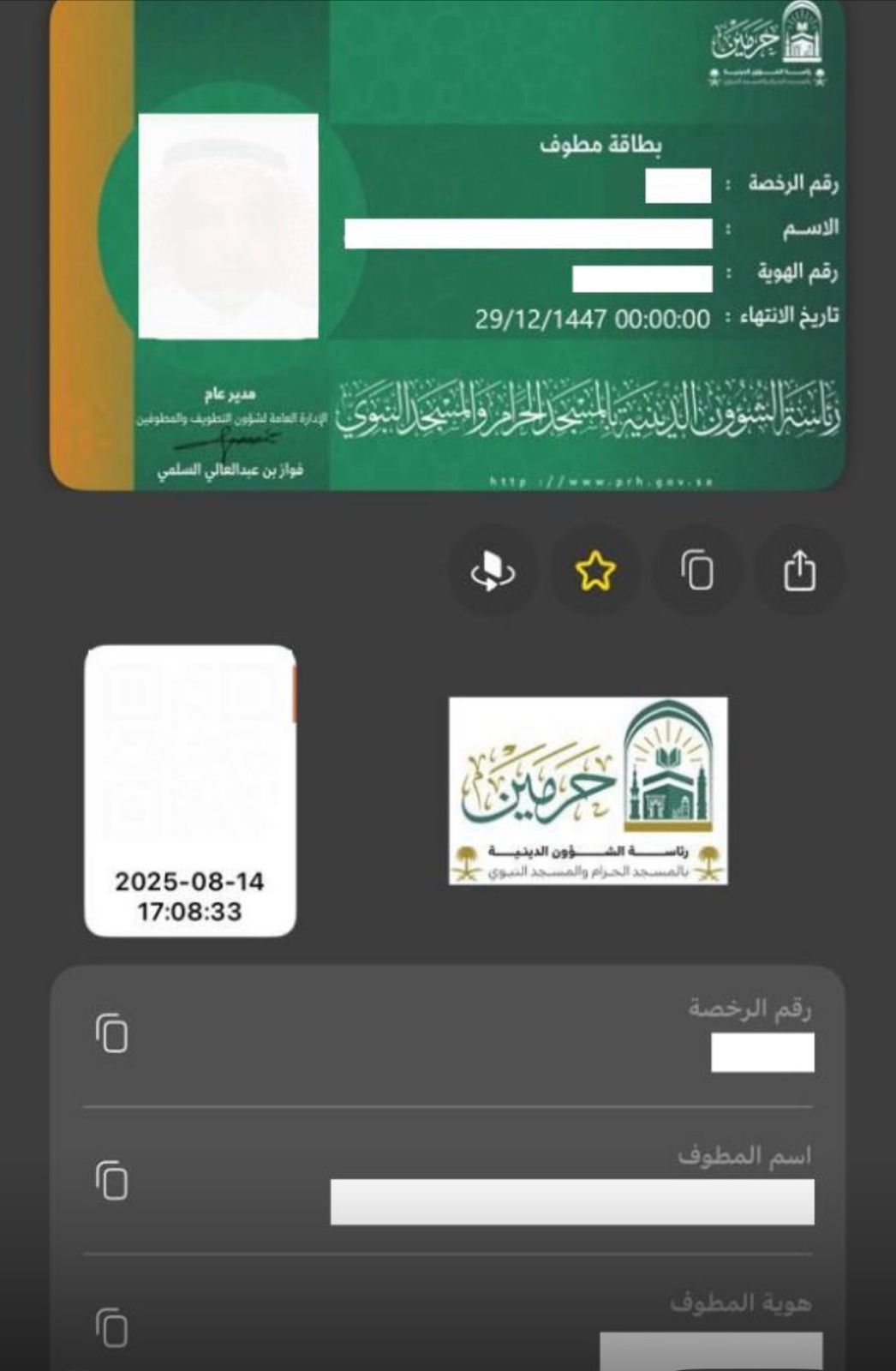 عززت رئاسة الشؤون الدينية المسار الإثرائي للمطوفين ؛ حيث سلمت رئاسة الشؤون الدينية بالمسجد الحرام والمسجد النبوي، اليوم الأربعاء٢٦/٢/١٤٤٧ كبار المطوفين في المسجد الحرام الرخصة الأولى المعتمدة لتطويف الطائفين الراغبين بتطويفهم عبر تطبيق “توكلنا”
