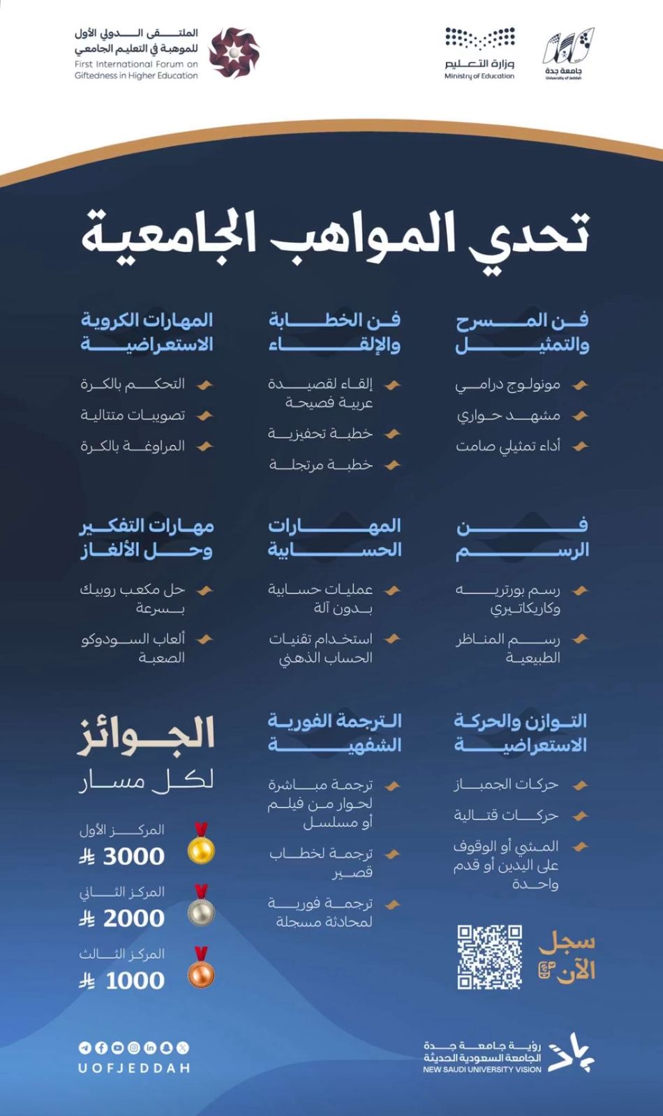 تُمنح للفائزين في المراكز الأولى جوائز مالية، التسجيل متاح لطلاب الجامعات في أنحاء المملكة عبر الرابط التالي: