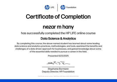 تمكن الطفل المصري نزار محمد هاني، البالغ من العمر 12 عامًا، من الحصول على شهادة معتمدة في علم البيانات والتحليلات (Data Science & Analytics) من منصة HP LIFE التابعة لمؤسسة HP العالمية، ليُثبت شغفه وتميّزه المبكر في أحد أكثر المجالات تطورًا في العصر الرقمي.