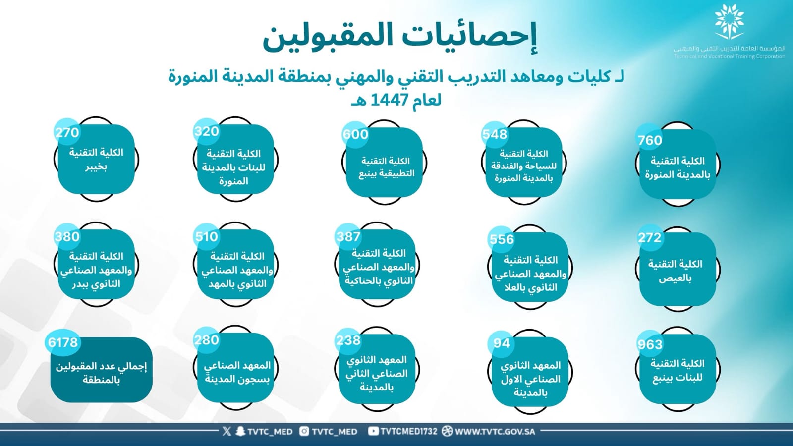 وتضمنت إحصائية القبول في 14 منشأة تدريبية في المنطقة، قبول (760 متدربًا)، في الكلية التقنية بالمدينة المنورة و(548 متدربًا) في الكلية التقنية للسياحة والفندقة بالمدينة المنورة، و(600 متدرب) في الكلية التقنية التطبيقية بينبع، و(320 متدربة) في الكلية التقنية للبنات بالمدينة المنورة، و(963 متدربة) في الكلية التقنية للبنات بينبع، إضافة إلى (270 متدربًا) في الكلية التقنية بمحافظة خيبر، و(556 متدربًا) في الكلية التقنية والمعهد الصناعي الثانوي بمحافظة العلا، و(387 متدربًا) في الكلية التقنية والمعهد الصناعي الثانوي بمحافظة الحناكية، و(510 متدربين) في الكلية التقنية والمعهد الصناعي الثانوي بمحافظة المهد، و(380 متدربًا) في الكلية التقنية والمعهد الصناعي الثانوي بمحافظة بدر، وكذلك (272 متدربًا) في الكلية التقنية بمحافظة العيص، كما تضمن قبول (94 متدربًا) في المعهد الصناعي الأول بالمدينة المنورة، و(238 متدربًا) في المعهد الصناعي الثاني الثانوي بالمدينة المنورة، إضافة إلى (280 متدربًا) في المعهد الصناعي بسجون المدينة المنورة.