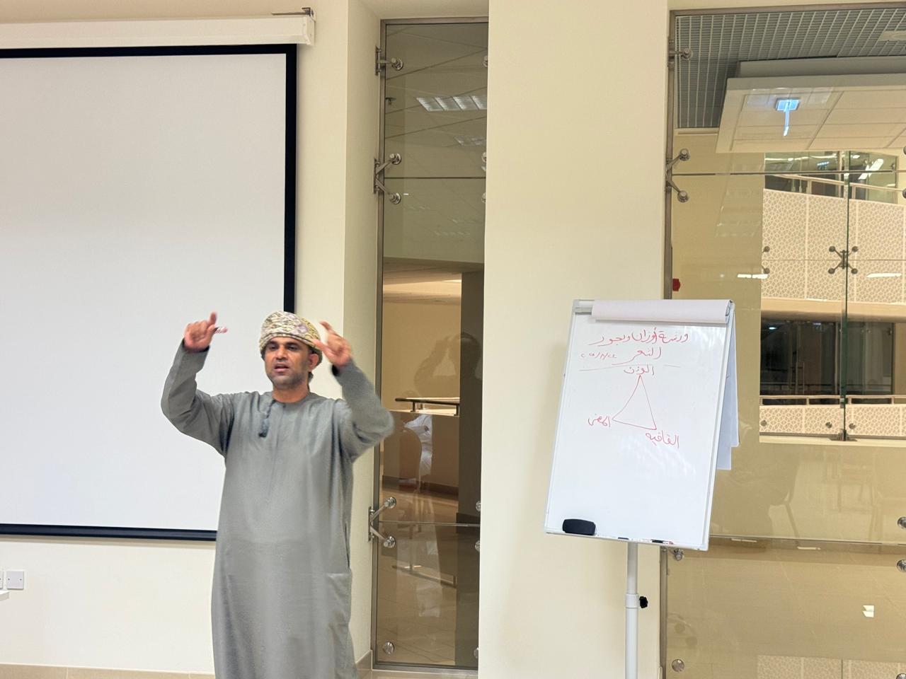 ناقش مقدم الورشة عدة محاور منها أساسيات التقطيع وأنواع الرجز والمسحوب وبحر الهجيني الطويل وكذلك المثلث الشعري الذي يتكون من الوزن والقافية والمعنى بوصفه الركيزة الأساسية التي يقوم عليها النص الشعري المتكامل وقدّم المدرب شرحًا مبسطًا حول التقطيع العروضي واللحني، مستعرضًا نماذج إيقاعية مثل الملالاة والدن والتنعيم و أكد على أن الإلمام بالاوزان والبحور لا يقيد الموهبة الشعرية بل يمنحها أفقا واسعا من اللإبداع .