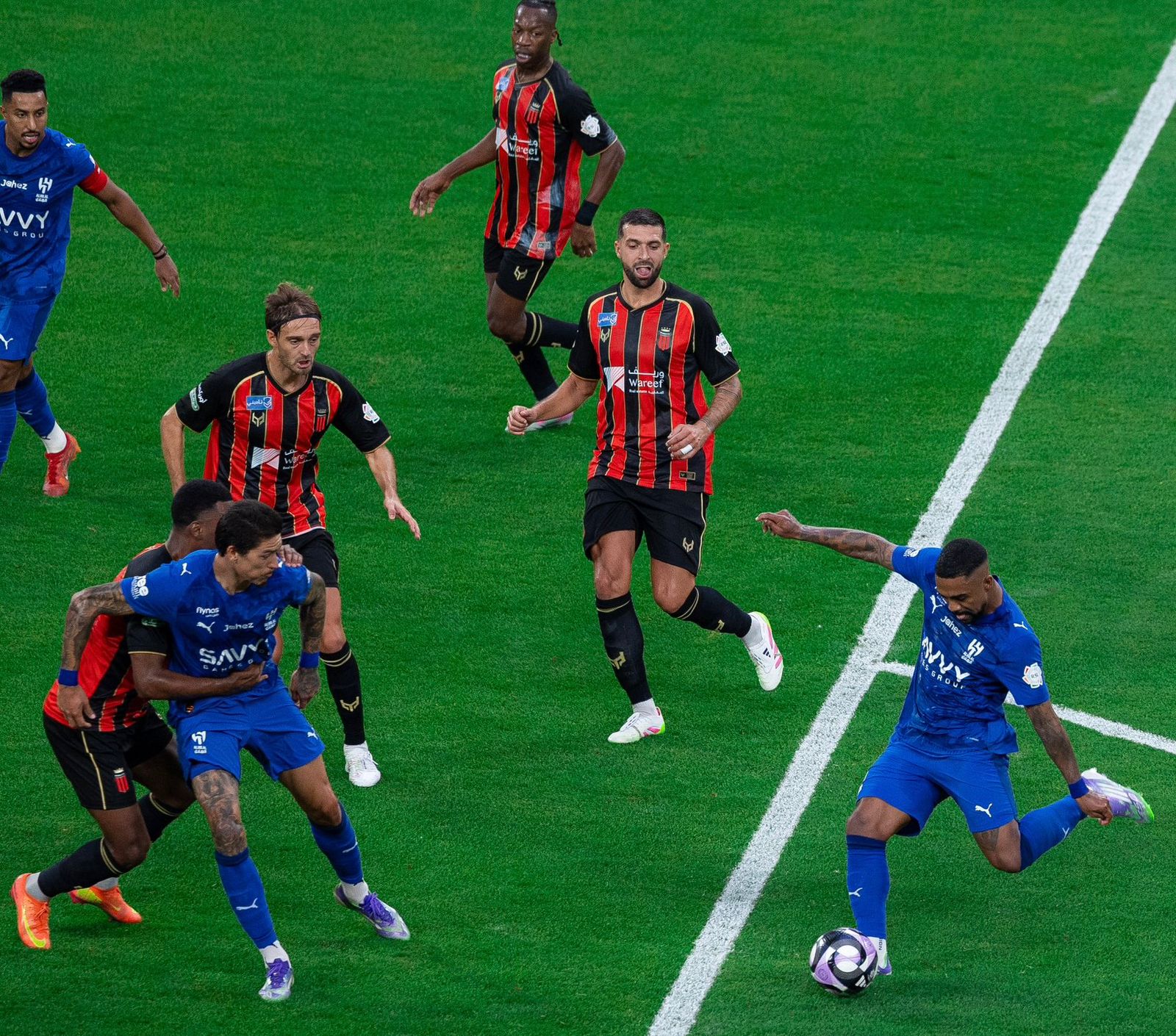 وجاء الهدف الأول بتصويبة قوية من الظهير الأيسر متعب الحربي في الدقيقة 22، بعدما استغل كرة خلف الدفاع، ليسدد بعدها صاروخية لم يتمكن حارس الرياض من التصدي لها.