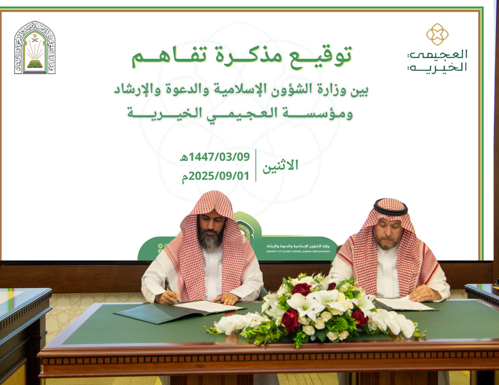 وقعت وزارة الشؤون الإسلامية والدعوة والإرشاد اليوم الإثنين الثامن من شهر ربيع الأول لعام ١٤٤٧هـ إتفاقية تعاون مشترك مع مؤسسة عبدالعزيز ومحمد العجيمي الخيرية، وذلك في مقر ديوان الوزارة بالرياض بحضور عدد المسؤولين من الجانبين.