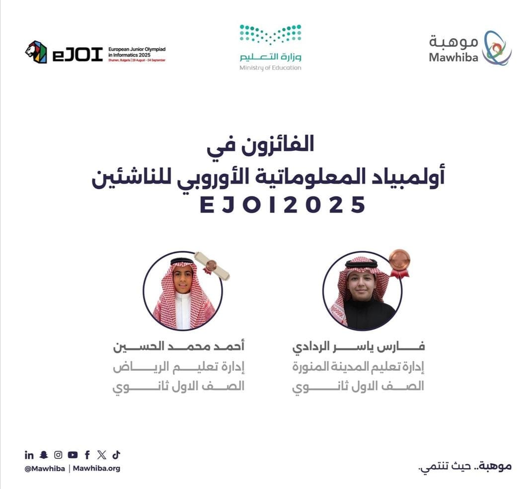 ونال الطالب في الصف الأول الثانوي فارس ياسر الردادي، من إدارة تعليم المدينة المنورة الميدالية البرونزية، وحصل الطالب في الصف الأول الثانوي أحمد عبدالرحمن الحسين من إدارة تعليم الرياض على شهادة تقدير لتسجل المملكة حضورها الأول في المنافسة بجائزتين دوليتين.