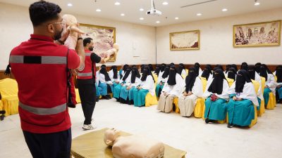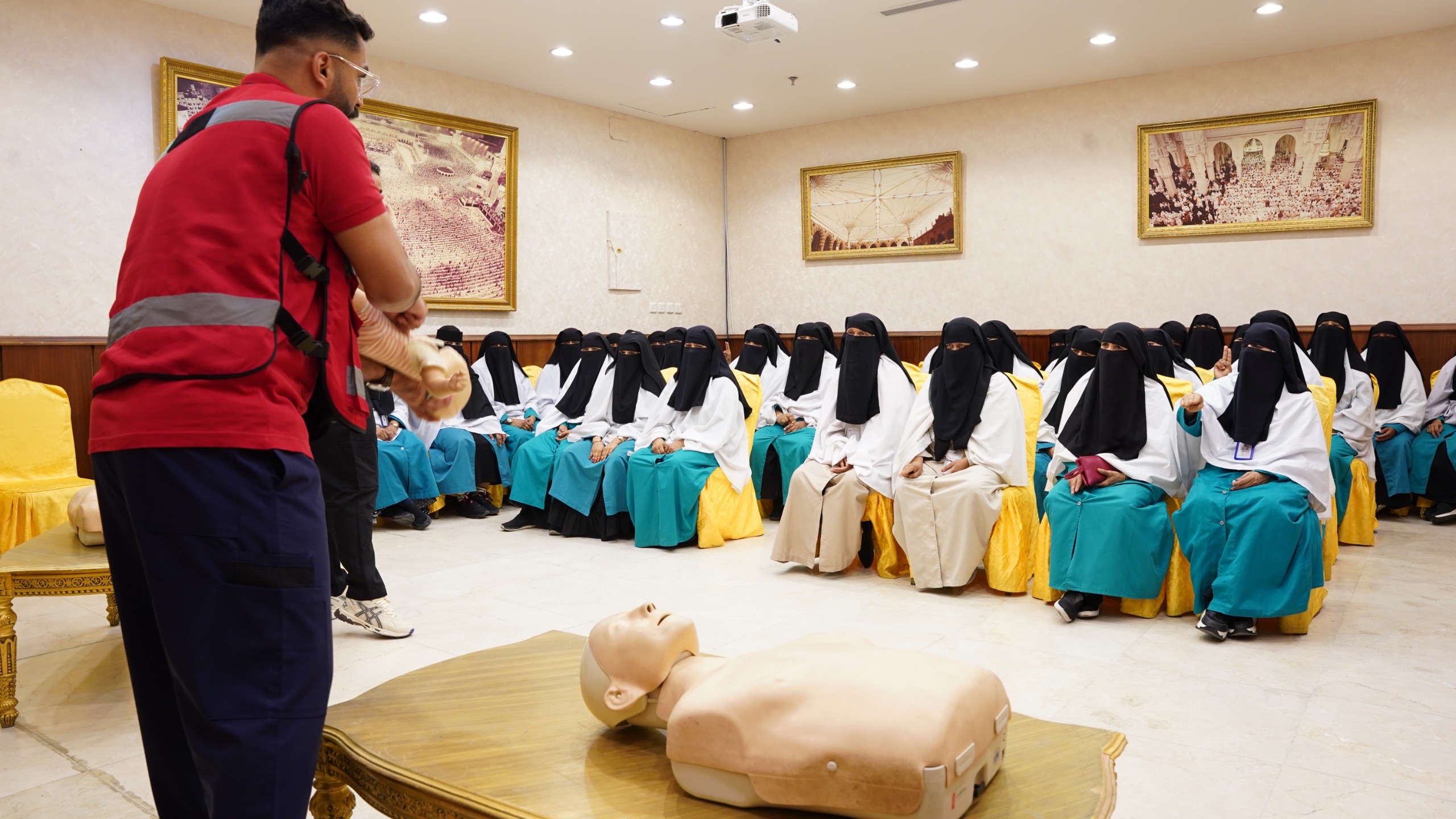 وشهدت الورشة استفادة أكثر من 3,860 متدرباً من منسوبي القطاعات العاملة بالمسجد الحرام، حيث تناولت عدداً من المحاور النظرية والتطبيقات العملية في كيفية التعامل مع أبرز الحالات الطارئة، مثل الإغماء، ضيق التنفس، النزيف، والإصابات البسيطة. كما تم تدريب المشاركين على مهارات الإنعاش القلبي الرئوي وكيفية التعامل واستخدام جهاز الرجفان القلبي الرئوي الكهربائي (AED) بما يسهم في رفع كفاءتهم في التعامل مع الحالات الحرجة.