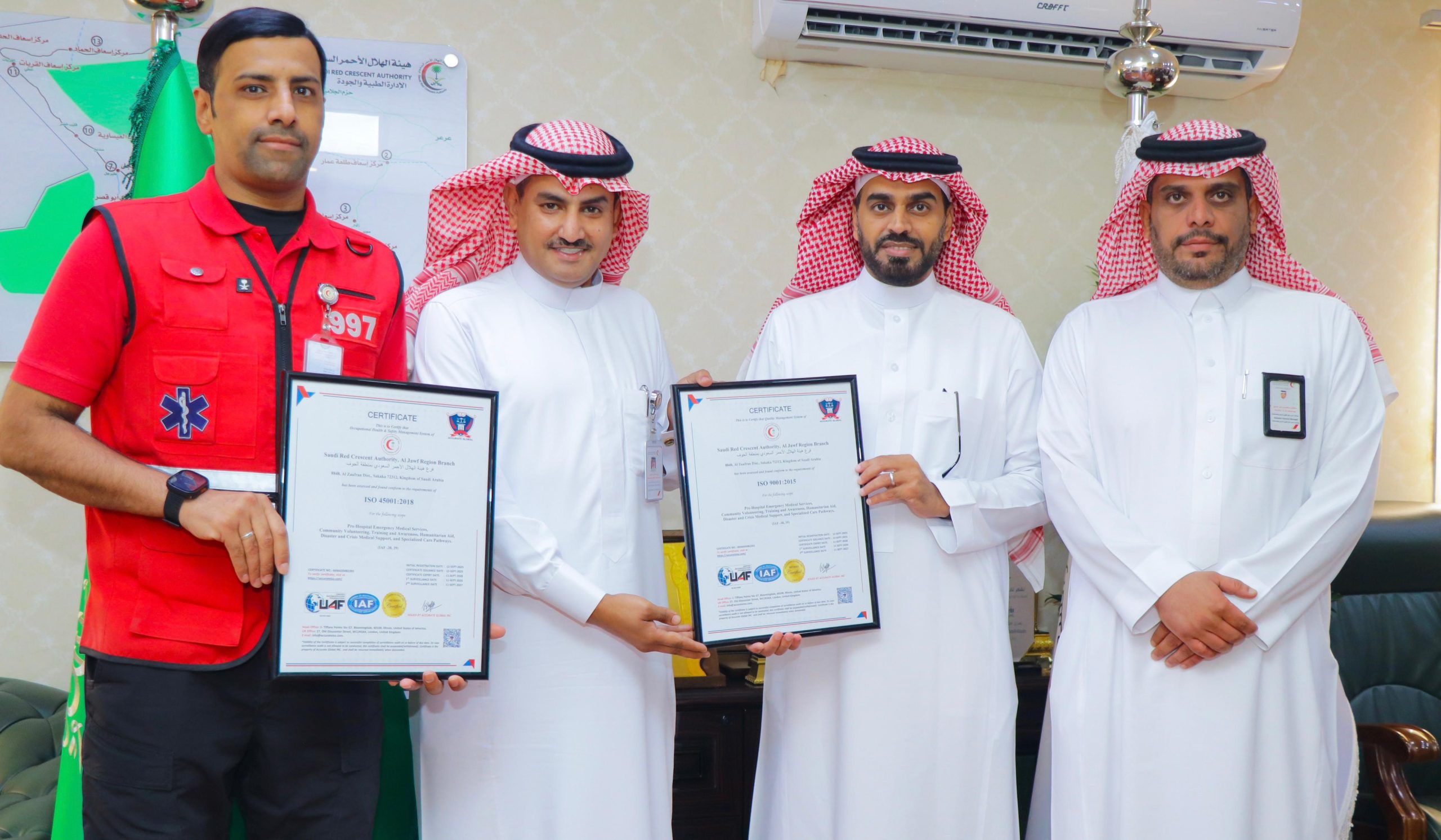 حقق فرع هيئة الهلال الأحمر السعودي بمنطقة الجوف إنجازًا نوعيًا بحصوله على شهادة المنظمة الدولية للمواصفات القياسية “الآيزو” ISO 45001 في نظام الصحة والسلامة المهنية، إذا يعتبر منجزاً استثنائياً كأول فرع على مستوى فروع الهلال الأحمر السعودي ممن حصل على هذا الاعتماد الدولي، إضافة إلى شهادة ISO 9001 في نظام إدارة الجودة، وذلك بعد اجتيازه لمتطلبات ومعايير الجودة العالمية وتطبيقه أفضل الممارسات الإدارية والتنظيمية.