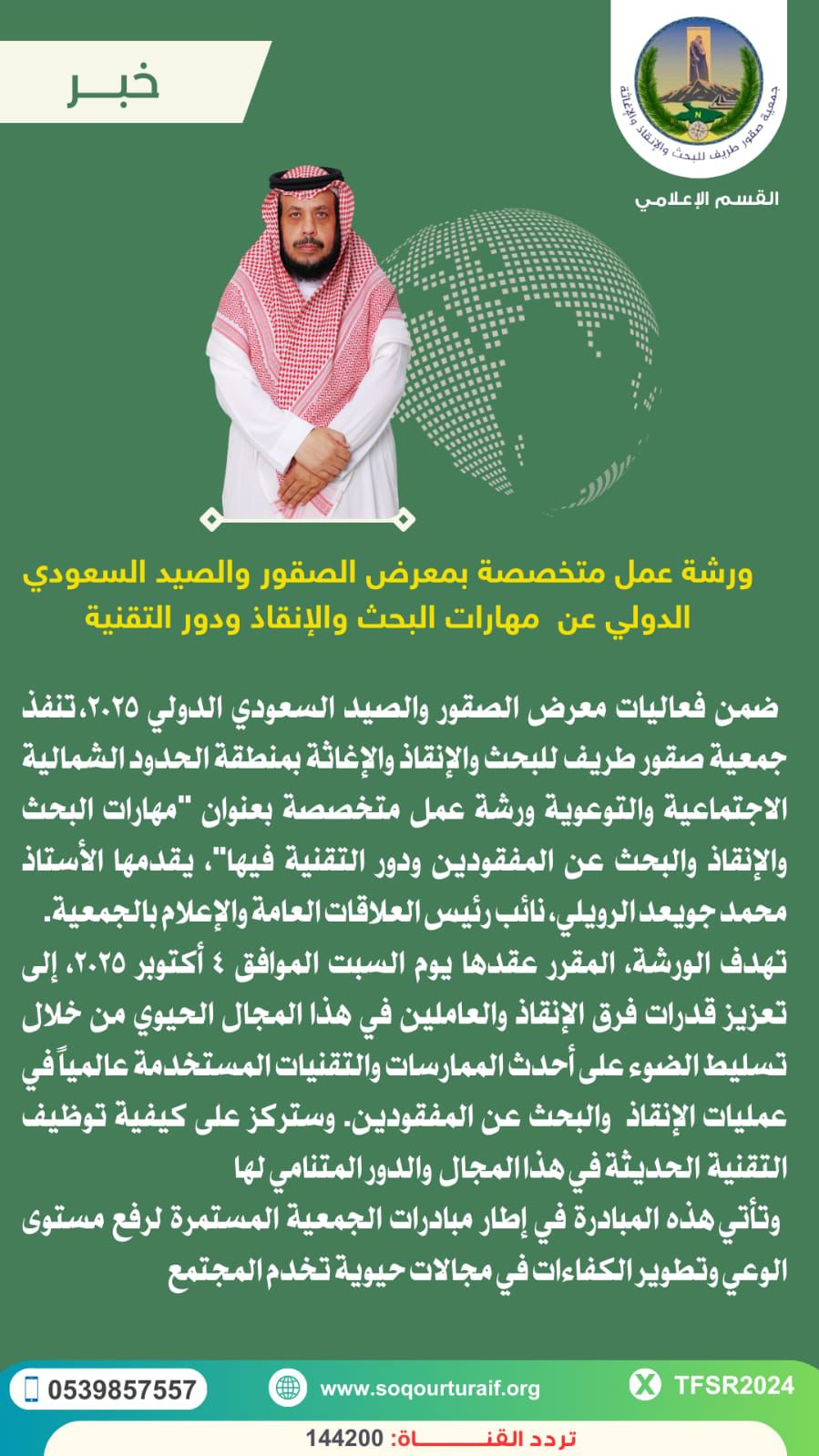 ضمن فعاليات معرض الصقوروالصيدالسعودي الدولي ٢٠٢٥، تنفذ جمعية صقور طريف للبحث والإنقاذ والإغاثة بمنطقة الحدود الشمالية الاجتماعية والتوعوية ورشة عمل متخصصة بعنوان “مهارات البحث والإنقاذ والبحث عن المفقودين ودور التقنية فيها”، يقدمها *الأستاذ محمد جويعد الرويلي،* نائب رئيس العلاقات العامة والإعلام بالجمعية.