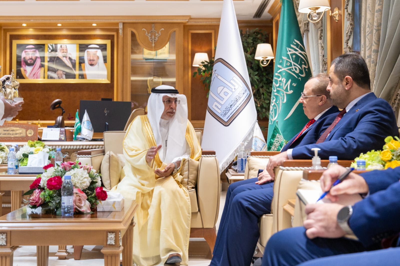 وفي بداية اللقاء رحّب معالي رئيس الجامعة أ.د. العامري بالوزير والوفد المرافق له، معربًا عن سعادته بهذه الزيارة، ومؤكدًا أن جامعة الإمام محمد بن سعود الإسلامية بما تمتلكه من تاريخ علمي راسخ وتنوع أكاديمي واسع، قد حققت حضورًا مميزًا في التصنيفات العالمية وأسهمت في تخريج قيادات بارزة في مختلف المجالات، وأوضح معاليه أن هذا التنوع والانتشار يعكس قدرة الجامعة على بناء شراكات فاعلة مع المؤسسات التعليمية حول العالم، مشيرًا إلى حرص الجامعة على توظيف خبراتها في مجالات البحث العلمي والاعتماد الأكاديمي، وتطوير المناهج لتعزيز التعاون مع وزارة التعليم العالي في سوريا، وأكد معاليه استعداد الجامعة التام لبناء شراكات استراتيجية بين الجامعة والجامعات السورية؛ من خلال تبادل أعضاء هيئة التدريس والطلاب، وإطلاق برامج ومشاريع مشتركة تخدم التنمية في البلدين وتحقق التكامل في مجالات التعليم العالي والبحث العلمي.