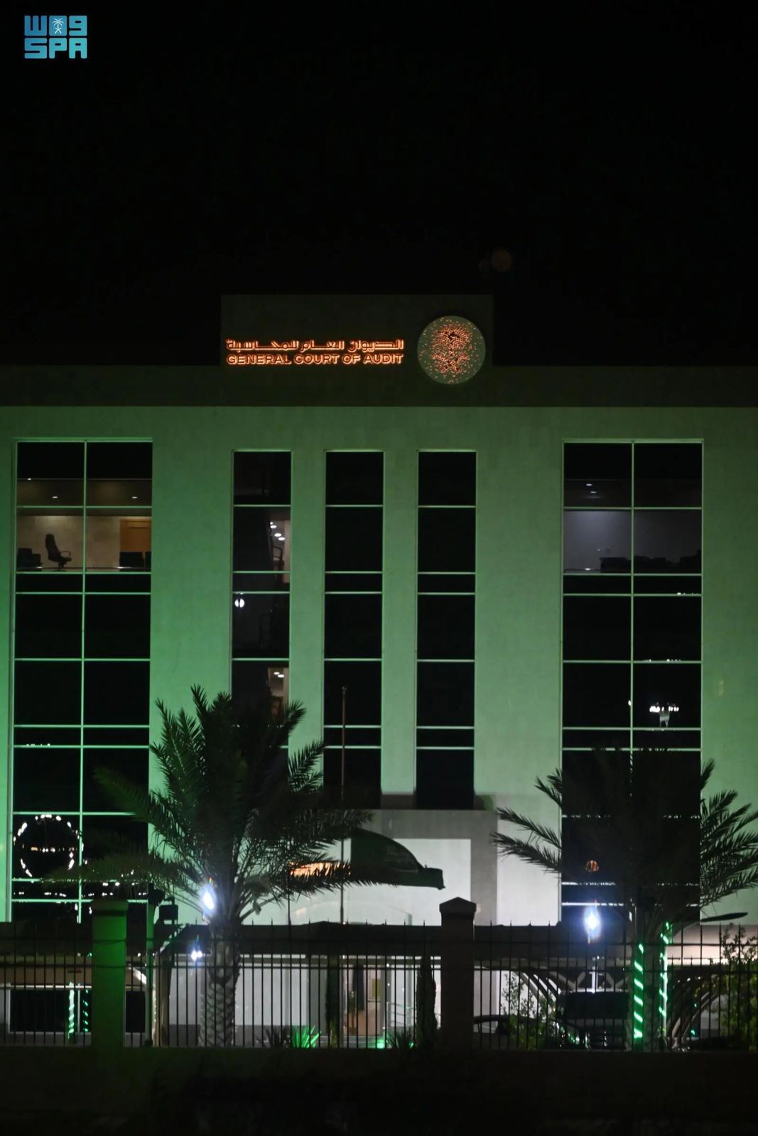 توشحت المباني الحكومية والشوارع والحدائق والميادين والمعالم البارزة في منطقة تبوك باللون الأخضر، في لوحة وطنية بهيجة احتفاءً باليوم الوطني الـ95 للمملكة، تحت شعار “عزّنا بطبعنا”.