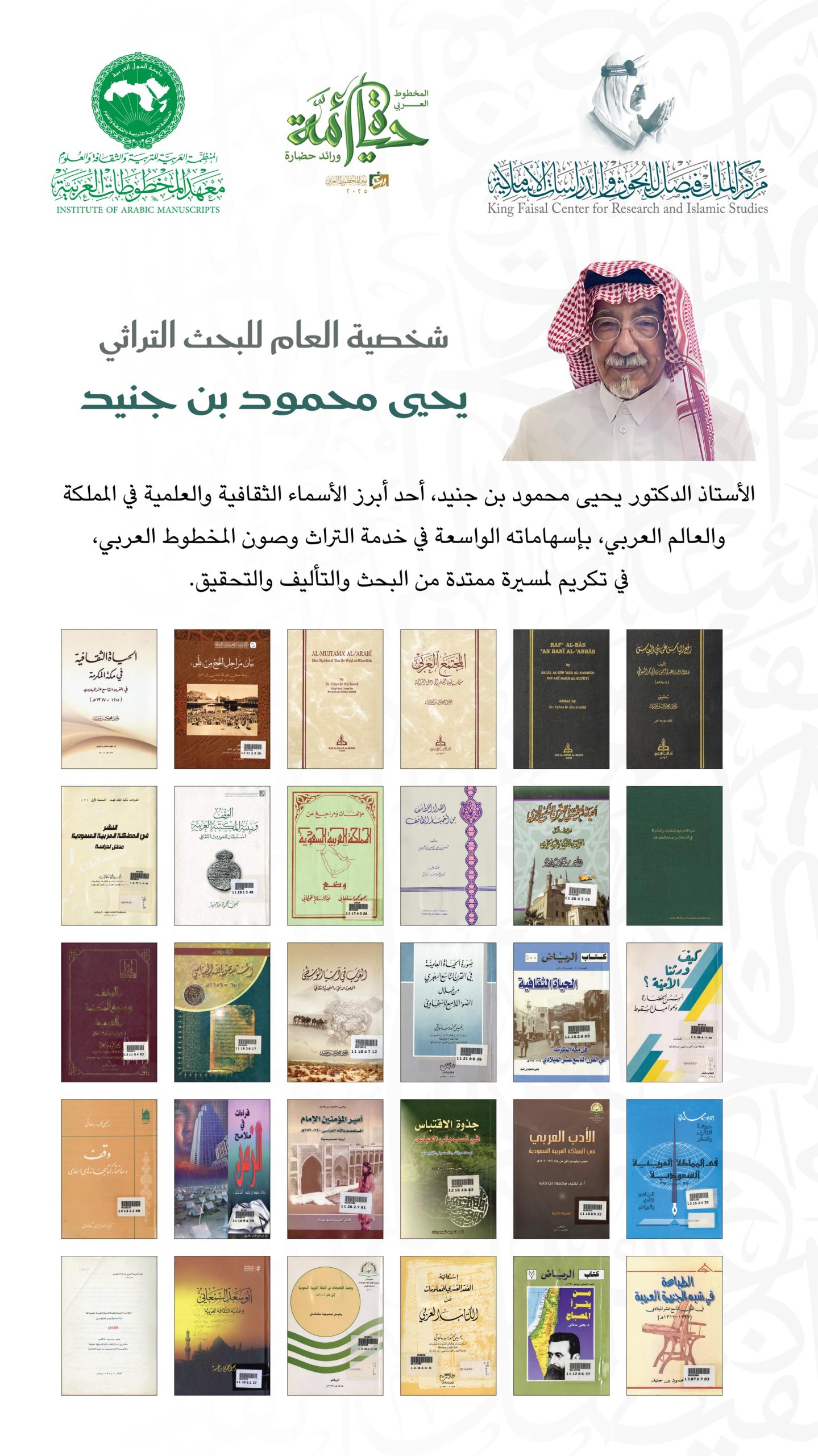 اختير الأستاذ الدكتور يحيى محمود بن جنيد شخصية العام التراثية في الاحتفال بيوم المخطوط العربي لعام 2025، تقديرًا لإسهاماته الواسعة في خدمة التراث وصون المخطوط العربي، وتكريمًا لمسيرة امتدت عقودًا في البحث والتأليف والتحقيق.