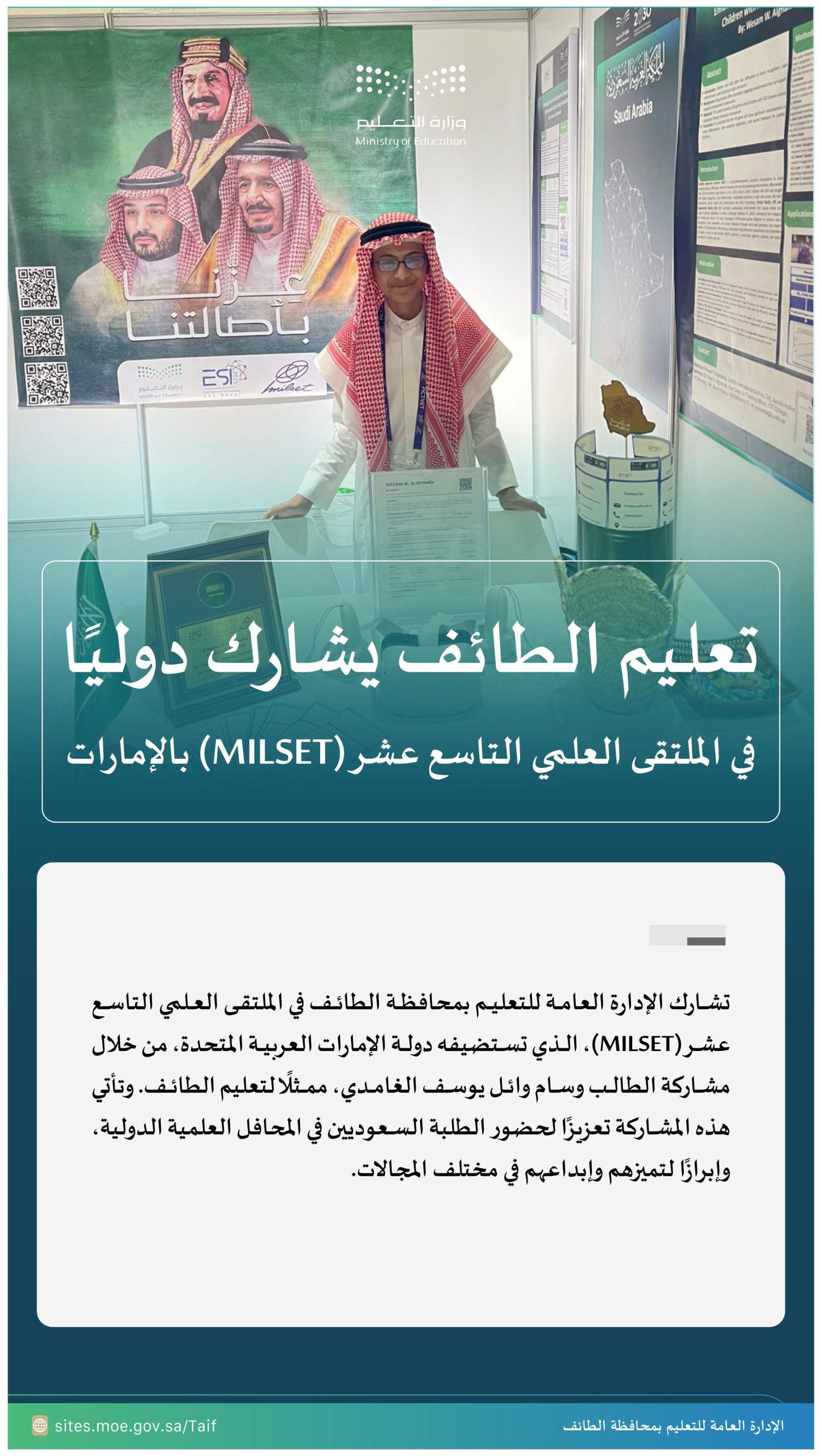 في خطوة تعكس التميز في مجال رعاية الموهوبين وتعزيز الحضور العلمي الدولي، يشارك الطالب وسام وائل يوسف الغامدي من مدارس شروق المملكة العالمية، التابعة للإدارة العامة للتعليم بمحافظة الطائف، حالياً في الملتقى العلمي التاسع عشر (MILSET) الذي تستضيفه دولة الإمارات العربية المتحدة.