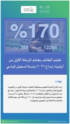 تزايدت نسبة تسجيل الطلبة الموهوبين في الإدارة العامة للتعليم في الطائف بنسبة 170% حيث بلغ عدد الطلبة المسجلين 12288 طالباً وطالبة يمثلون 388 مدرسة في دلالة واضحة على حجم الإقبال والتنافسية العالية بين الطلبة الموهوبين والموهوبات