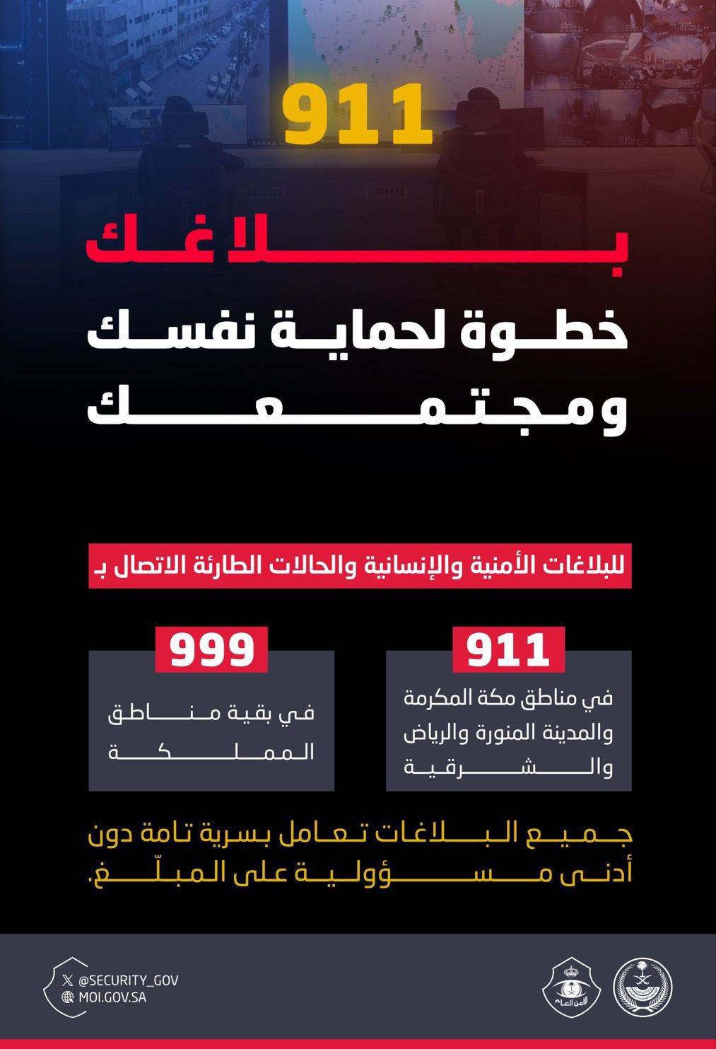 وأوضح أن مركز العمليات الأمنية الموحدة (911) يستقبل البلاغات في مناطق مكة المكرمة والمدينة المنورة والرياض والمنطقة الشرقية، فيما يتم استقبالها عبر الرقم (999) في بقية مناطق المملكة، وذلك على مدار الساعة.