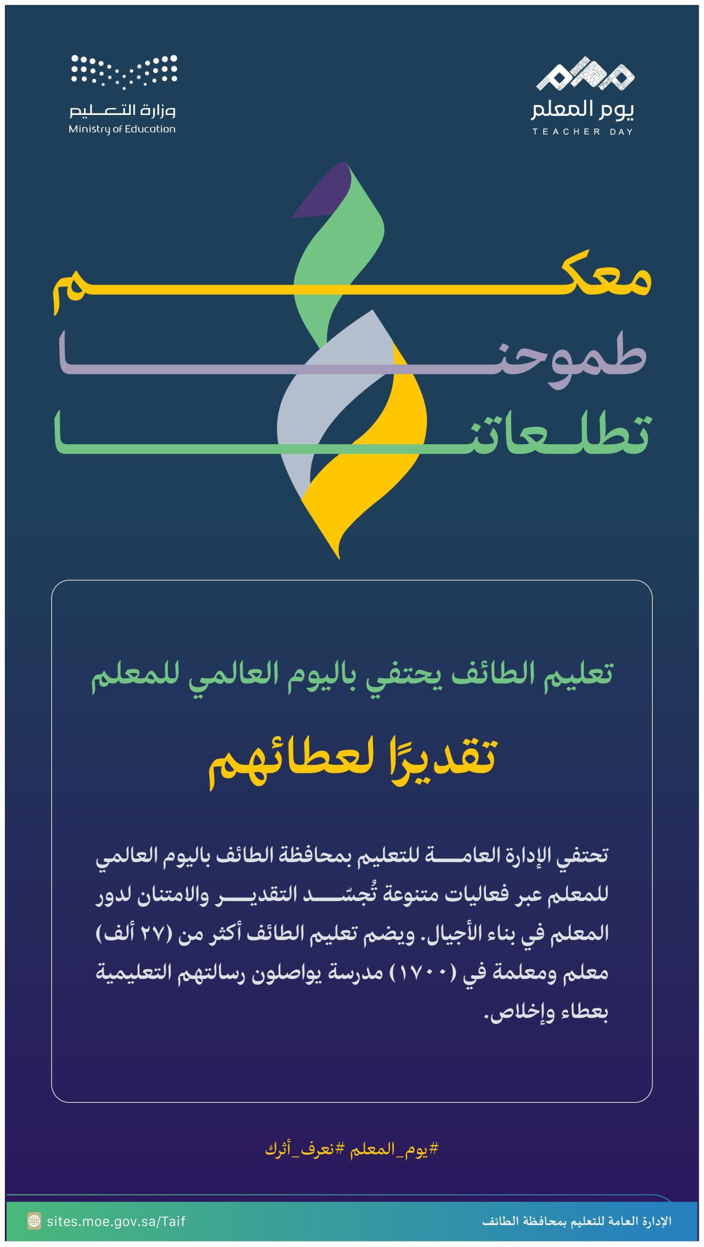 وأوضح المدير العام للتعليم في الطائف الدكتور سعيد بن عبدالله الغامدي أن الإدارة أعدّت خطة اتصالية للاحتفاء بهذه المناسبة على مدى 5 أيام في المدارس ، تبدأ يوم الأحد 5 أكتوبر وتستمر حتى الخميس 9 أكتوبر، مبينًا أن الخطة تضمنت تنفيذ العديد من الأنشطة والتغطيات الإعلامية، شملت تفعيل حسابات التواصل الاجتماعي للإدارة إلى جانب مختلف الوسائل الإعلامية الداخلية للإدارة إضافة إلى حفل احتفاء لتكريم المتميزين وأصحاب المبادرات،