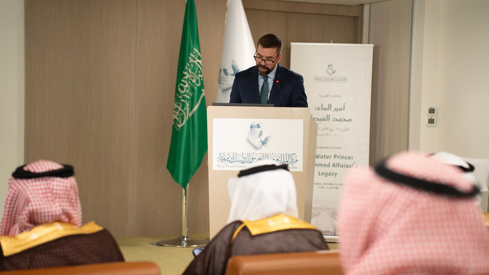 نظم مركز الملك فيصل للبحوث والدراسات الإسلامية الذي يتخذ من العاصمة السعودية مقراً له أمس محاضرة للباحث مايكل كريستوفر لو تحت عنوان ” أمير الماء” بحضور صاحب السمو الملكي الأمير تركي الفيصل، والمهندس شارخ الشارخ نائب رئيس هيئة المياه للشؤون الفنية والمشروعات، والمهندس عبدالعزيز الشيباني وكيل وزارة البيئة والمياه والزراعة، وعدد من المسؤولين والمهتمين.