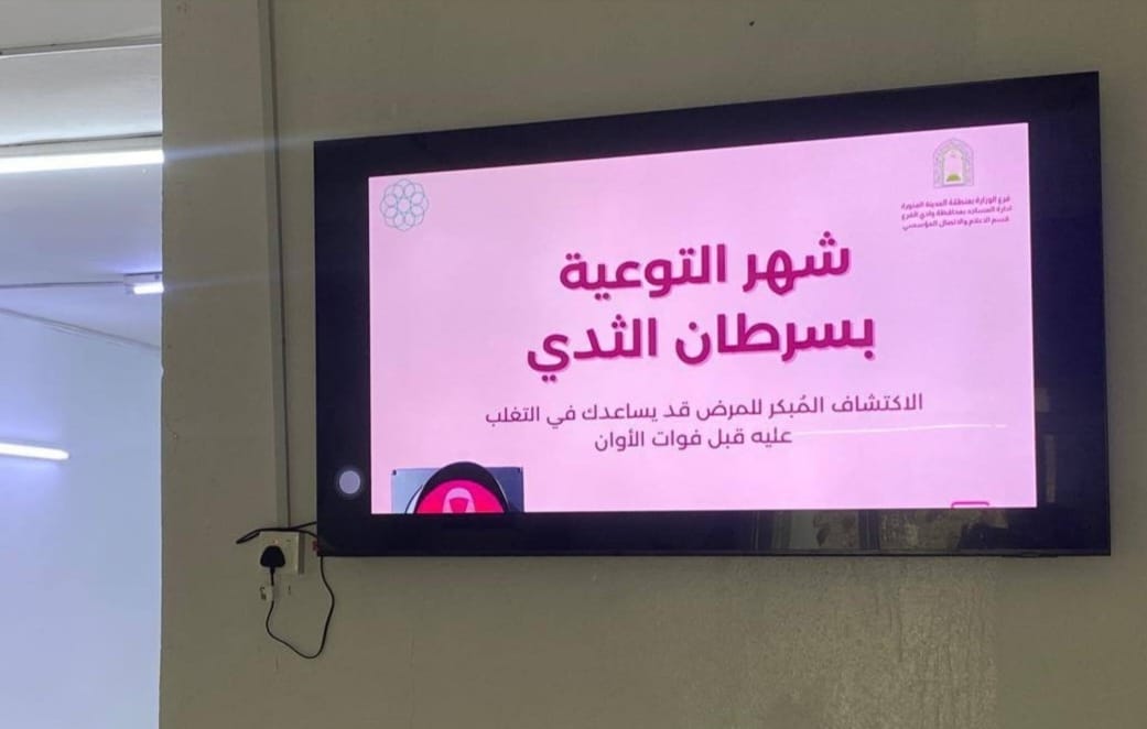 شارك فرع وزارة الشؤون الإسلامية والدعوة والإرشاد بمنطقة المدينة المنورة ممثلاً بإدارة المساجد والدعوة والإرشاد بمحافظة وادي الفرع، يوم الخميس الماضي السابع عشر من شهر ربيع الآخر 1447هـ، في الحملة التوعوية مخصصة للموظفات عن سرطان الثدي، وذلك تزامنًا مع الشهر العالمي للتوعية بهذا المرض.