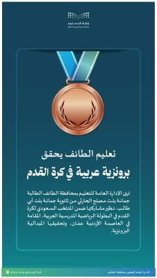 حققت الطالبة جمانة بنت مصلح الحارثي، من الإدارة العامة للتعليم بمحافظة الطائف، من مدرسة ثانوية جمانة بنت أبي طالب، الميدالية البرونزية وذلك نظير مشاركتها ضمن المنتخب السعودي لكرة القدم المشارك في البطولة الرياضية المدرسية العربية بالعاصمة الأردنية عمّان.