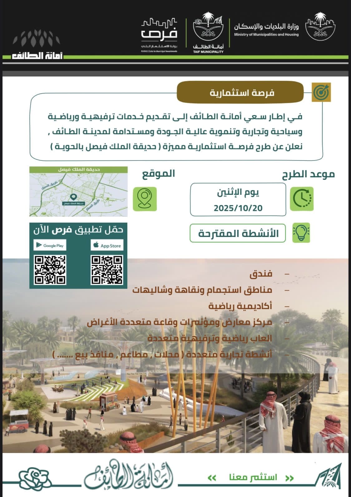 تعتزم أمانة الطائف طرح حديقة الملك فيصل بالقديرة للاستثمار في منافسة عامة، وذلك يوم الاثنين المقبل ٢٠/١٠/٢٠٢٥م، ضمن سعي الامانة لتقديم خدمات ترفيهية ورياضية وسياحية وتجارية وتنموية عالية الجودة ومستدامة.