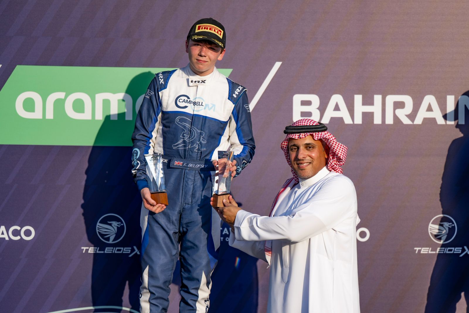 وفي ختام السباق، توج صاحب السمو الملكي الأمير خالد بن سلطان العبدالله الفيصل، رئيس مجلس إدارة الاتحاد السعودي للسيارات والدراجات النارية، وشركة رياضة المحركات السعودية، السائق البريطاني كيت بيلوفـسكي من فريق بيكس، بجائزة المركز الأول، فيما قدم سعادة الشيخ سلمان بن عيسى آل خليفة الرئيس التنفيذي لحلبة البحرين الدولية، جائزة المركز الثاني للسائق الهندي آري بانسال من فريق ماي كار، في حين سلم فواز القصيبي، السويدي سكوت كين ليندبلوم من فريق رد بُل، جائزة المركز الثالث، كما قدمت فيونا مورغان ريس، رئيسة الشؤون الرياضية للبطولة، جائزة أفضل متسابقة للهولندية اسمي كوسترمان، فيما سلم كلارو زيغان مدير السباق، جائزة أفضل سائق مبتدئ كيت بيلوفـسكي.