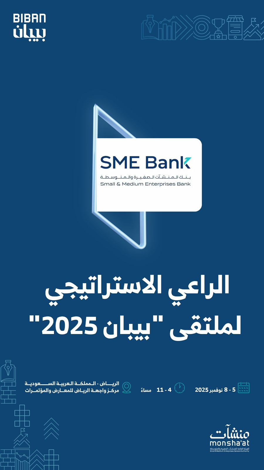 يُشارك بنك المنشآت الصغيرة والمتوسطة بصفته راعيًا إستراتيجيًا في ملتقى بيبان 2025، الذي تنظمه الهيئة العامة للمنشآت الصغيرة والمتوسطة “منشآت” خلال الفترة من 5 إلى 8 نوفمبر 2025 في مركز واجهة الرياض للمعارض والمؤتمرات، تحت شعار “وجهة عالمية للفرص”.