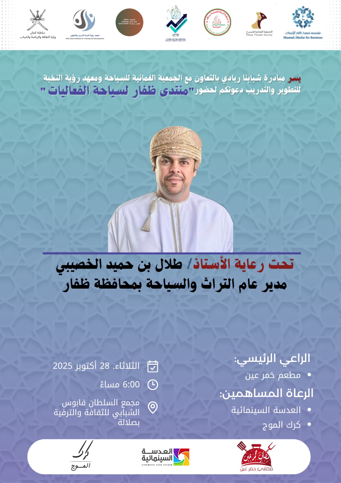 تستعد مبادرة شبابنا ريادي لإطلاق فعاليتها الجديدة بعنوان «منتدى ظفار لسياحة الفعاليات» مساء يوم الثلاثاء الموافق 28 أكتوبر 2025م، وذلك بمجمع السلطان قابوس الشبابي للثقافة والترفيه بصلالة، بالتعاون مع الجمعية العُمانية للسياحة ومعهد رؤية النخبة للتطوير والتدريب، وبمشاركة نخبة من الأكاديميين والخبراء وروّاد الأعمال في مجالات السياحة وإدارة الفعاليات.