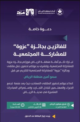 في إنجاز نوعي يجسّد روح المبادرة والمسؤولية الوطنية، تُوّج فريق “عين وطن” التطوعي بجائزة “عزوة” للمسؤولية المجتمعية في القطاع البلدي – مسار الفرق التطوعية المركز الثاني تقديرًا لجهوده الريادية وإسهاماته المؤثرة في تعزيز ثقافة التطوع في القطاع البلدي .