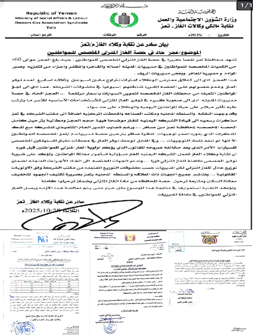 تشهد محافظة تعز منذ أسابيع أزمة خانقة في مادة الغاز المنزلي، تفاقمت بشكل غير مسبوق نتيجة عجز كبير في الكميات المخصصة للمحافظة من قبل الشركة اليمنية للغاز، وقدرت نقابة وكلاء الغاز حجم العجز بنحو 60% من إجمالي الحصة المقررة، الأمر الذي انعكس سلباً على المواطنين والوكلاء وأدى إلى اضطراب حاد في عملية التموين.