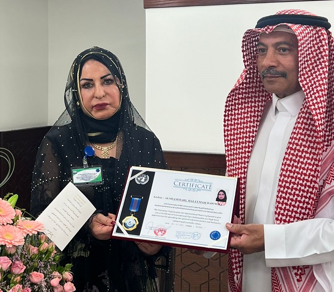 كرمت المنظمة الأوربية للسلام الأستاذة حليمة الشمري كسفيرة سلام دولية لما تتمتع به من خبرات كثيرة بعدة مجالات ولها حضور مميز في خدمة المجتمع، وقد تسلمت الشهادة من السفير د. منصور بن سعران عضو المنظمة بالسعودية. ألف مبروك التكريم للأستاذة حليمة الشمري.
