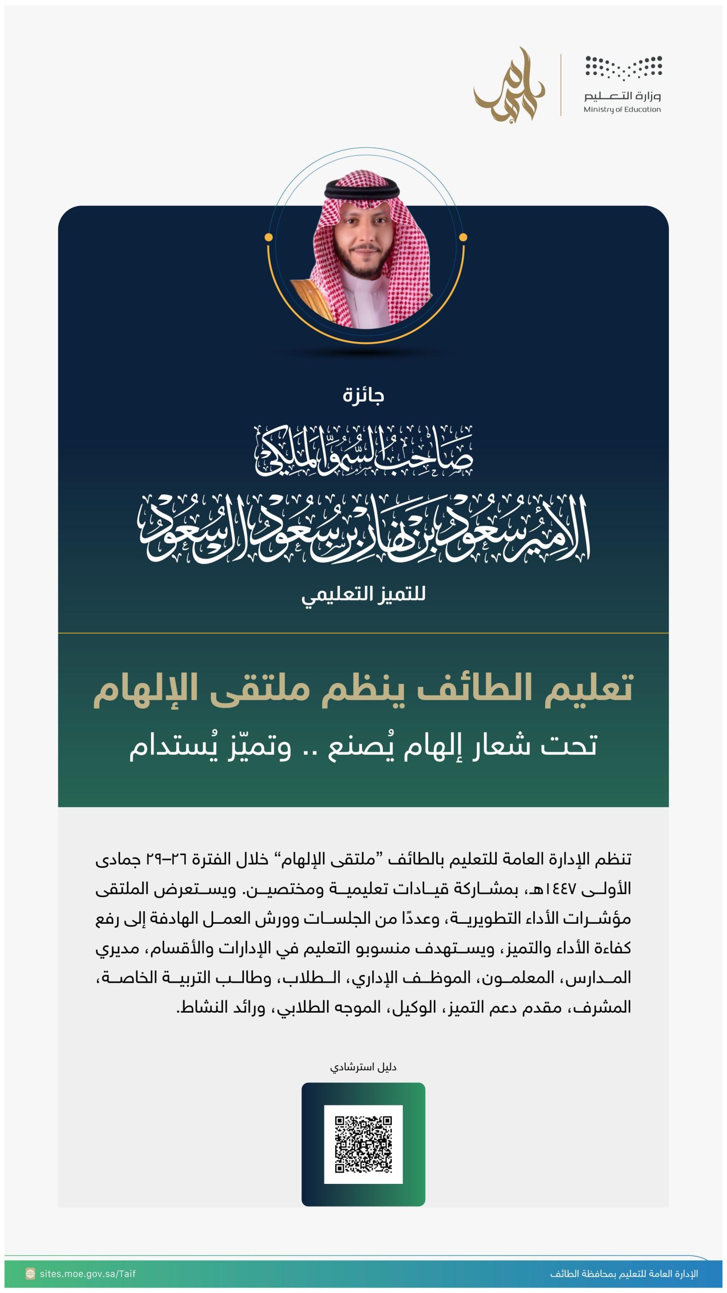 تنظّم الإدارة العامة للتعليم بمحافظة الطائف ملتقى الإلهام خلال الفترة من 26 إلى 29 جمادى الأولى 1447هـ عن بُعد، تحت شعار “إلهام يُصنع.. وتميّز يُستدام”، بمشاركة واسعة من القيادات التعليمية والمختصين، وبحضور منسوبي التعليم في مختلف الإدارات والأقسام.