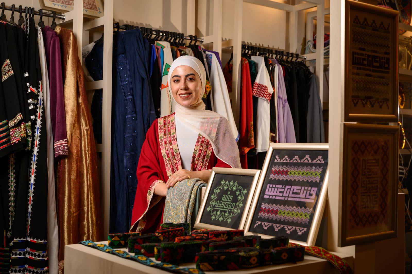نورهان بدأت رحلتها قبل خمس سنوات فقط، لكنها تتحدث عن المهنة كما لو أنها وُلدت وهي تمسك الإبرة. تقول بابتسامة متواضعة: “من ٥ سنين بدأت أصمم أزياء تراثية أردنية… ودخلت المجال حبًا فيه، لأنه جزء منّا”. ثم تشير إلى صف من الثياب المطرّزة التي تحيط بها من الجانبين: “الأزياء اللي جايبتها كلها من التراث… أغلب التطريزات فيها شغل يدوي على يد سيدات أردنيات”.