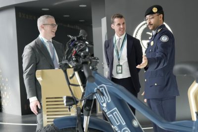 وتستعرض القوات، أحدث التجهيزات التقنية التي تعزز القدرات الأمنية وكفاءة العمل الميداني، والدراجة (الهجين) التي تستخدم في المناطق الحيوية لتسهيل التنقل لرجل الأمن.