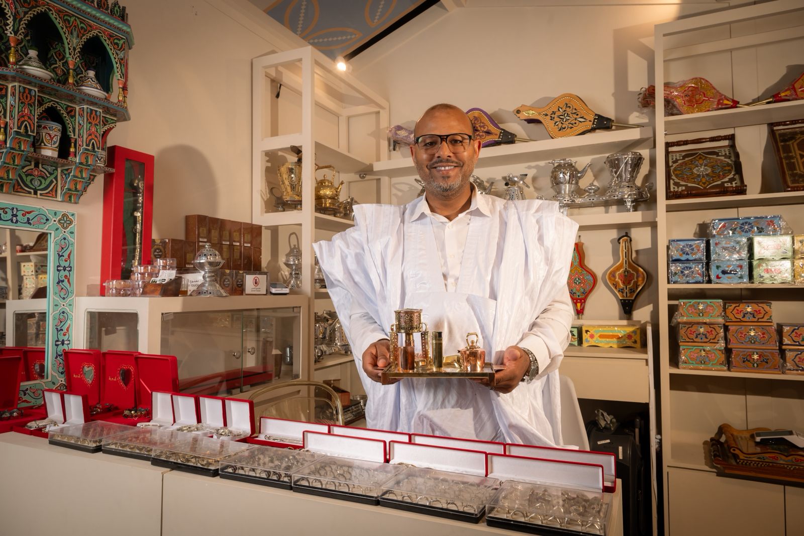 في الجناح المغربي داخل الأسبوع السعودي الدولي للحرف اليدوية “بنان”، يشع بريق النحاس والفضة في تفاصيل الأعمال التي يجلبها الحرفي المغربي عنديسلم يارا، حاملًا معه أكثر من ثلاثين عامًا من الخبرة في الصناعات التقليدية التي تعود جذورها إلى أسرته عبر أجيال متعاقبة، فمنذ طفولته، كانت أصوات طرق المعادن ورائحة الشاي الأخضر المصنوع بمهارة منزلية جزءًا من حياته اليومية، وأصبحت مع الوقت هويته التي لا ينفصل عنها.