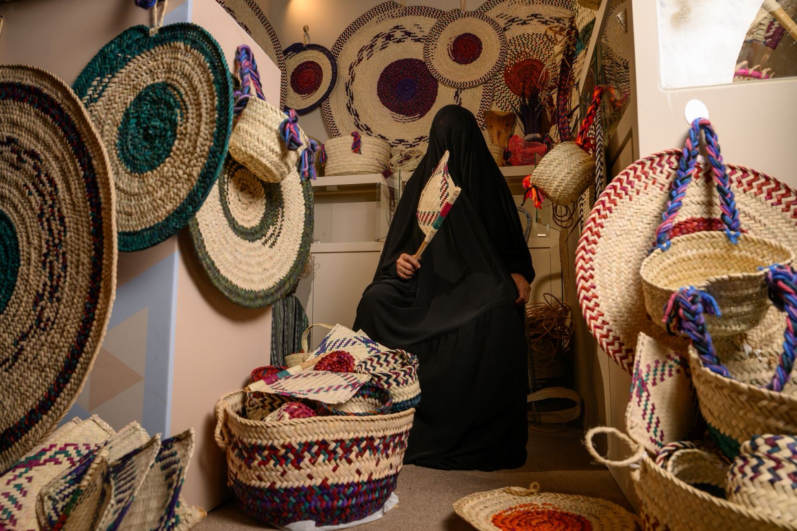 داخل أحد مسارات الحركة الهادئة في فعاليات “الأسبوع السعودي الدولي للحرف اليدوية – بنان”، تجلس الحرفية مدينة محمد أمام مساحة عرضها الخاصة، كأنها تعيد وصل الحاضر بماضٍ طويل تشكّل بين الخوص ورائحة الأسواق الشعبية. لا ترفع صوتها، ولا تستعجل حركة يديها، بل تمضي في عملها بثبات المتمرس الذي يعرف تماماً كيف تتحول الأعواد اليابسة إلى سلال وأوانٍ ومنتجات ذات روح.