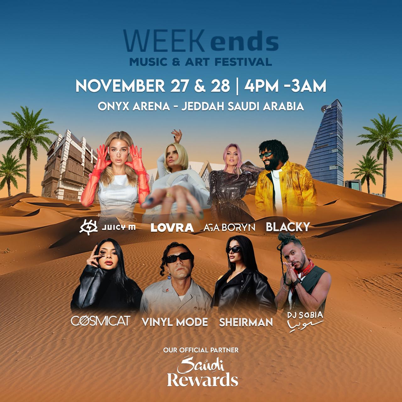 تنطلق يوم الخميس المقبل وبدعم من ” روح السعودية ” فعاليات مهرجان “ويكندز” للموسيقى والفنون في جدة، بمشاركة 22 فنانًا ونجمًا عالميًا ومحليًا، على مدار يومين متتاليين، 27-28 نوفمبر، في “أونيكس أرينا”