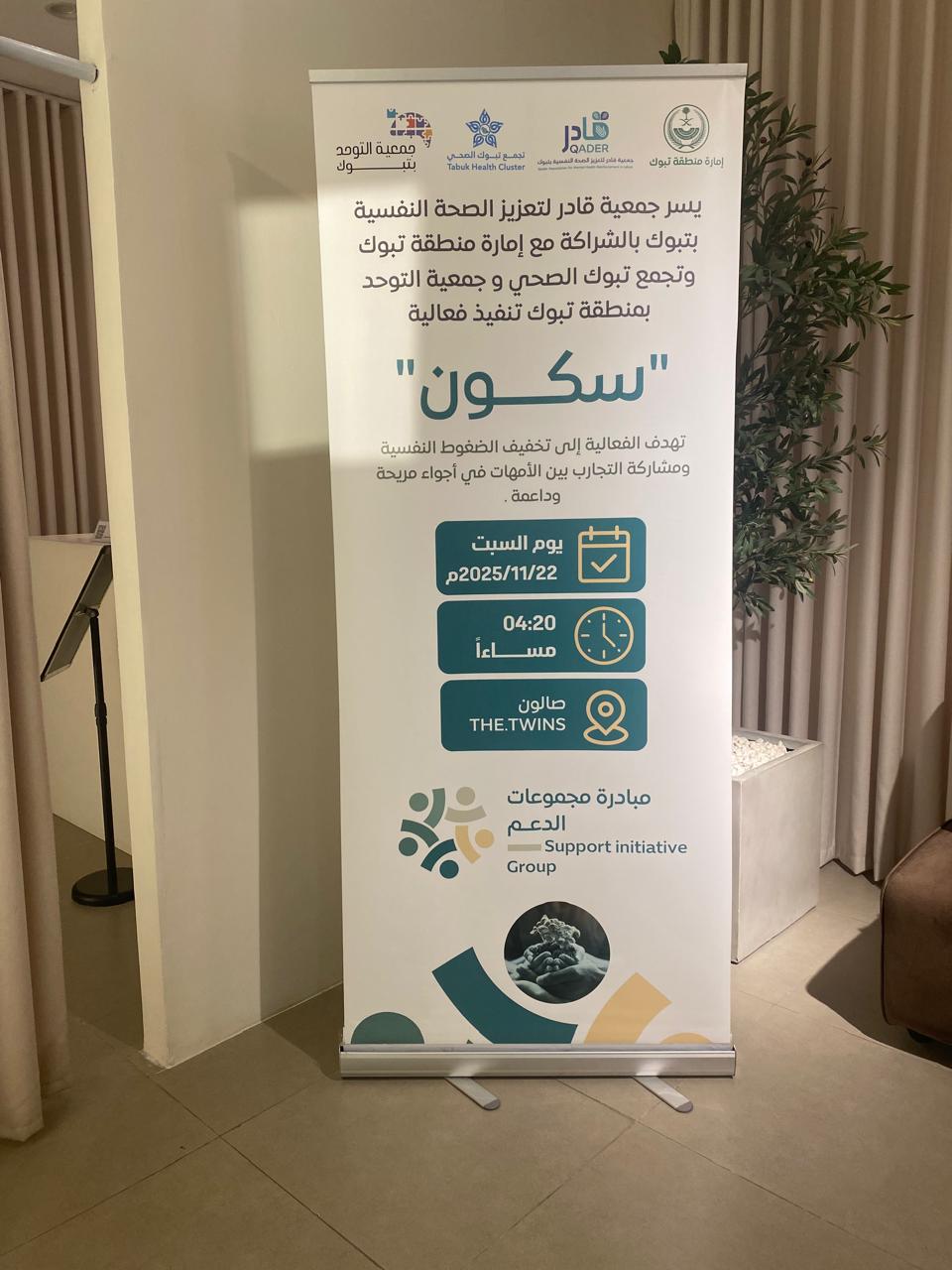 نظّمت جمعية قادر لتعزيز الصحة النفسية بتبوك، وبالتعاون مع إمارة منطقة تبوك وتجمع تبوك الصحي وجمعية التوحد بمنطقة تبوك، فعالية توعوية بعنوان “سكون” يوم السبت الموافق 22 نوفمبر 2025 في صالون The Twins، ضمن مبادرة مجموعات الدعم التي تهدف إلى توفير مساحة آمنة لأمهات أطفال التوحد للتعبير عن مشاعرهن ومشاركة تجاربهن وتلقي الدعم النفسي المناسب. وشهدت الفعالية حضور عدد من الأمهات المهتمات بالحصول على المشورة والتوجيه حول كيفية التعامل مع التحديات اليومية المرتبطة بتربية أطفال التوحد.