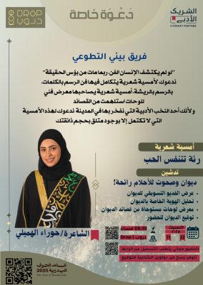 ٤/ معرض لوحات مستوحاه من قصائد الديوان، صاحبته فكره جميله وهي ، مشاركه فنانات تشكيليات في تطويع بعض القصائد باستخدام الالوان والريشه بحسب رؤيه كل فنانه للقصيده، ومن ثم عرضها الجمهور والتحدث عنها.