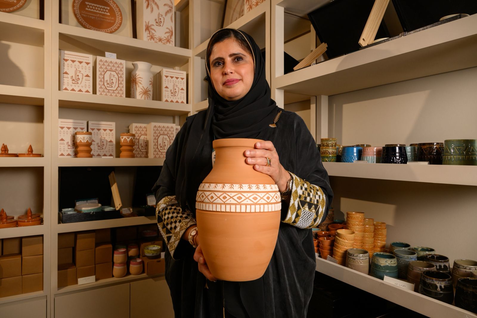 فاطمة التي بدأت رحلتها قبل “17 سنة” تقول إن الفخار بالنسبة لها “مو مجرد صناعة… هو جزء من الهوية”. تتعامل مع الطين كما يتعامل شخص مع شيء يعرفه منذ الطفولة، تعرف متى تروّضه ليكون كوبًا، ومتى تتركه يأخذ شكله الطبيعي ليصبح مبخرة أو مزهرية أو قطعة زخرفية لا تُكرر. وكل قطعة، كما تصفها، “فيها روح” لا يمكن استنساخها حتى لو حاولت.