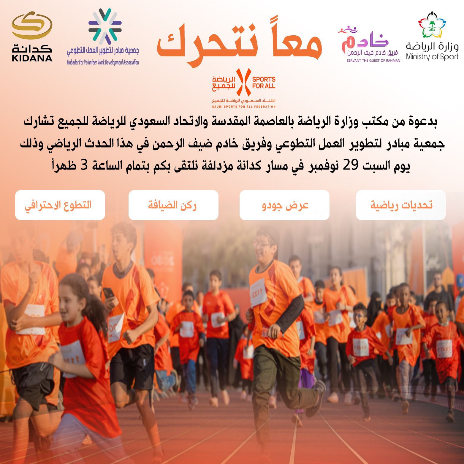 تشارك جمعية مبادر لتطوير العمل التطوعي وفريق خادم ضيف الرحمن غدًا السبت 29/11/2025 في فعالية (معاً نتحرك) ، وذلك بدعوة من مكتب وزارة الرياضة بالعاصمة المقدسة ، وبالشراكة مع الاتحاد السعودي للرياضة للجميع ، في مسار كِدانة بمزدلفة ، عند الساعة الثالثة عصرًا.