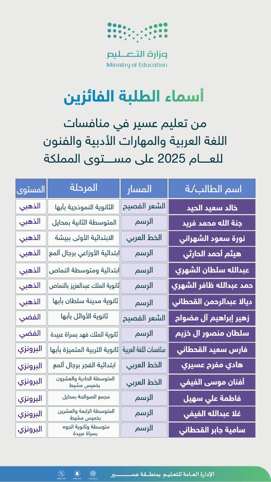 حققت الإدارة العامة للتعليم في منطقة عسير إنجازًا نوعيًا في منافسات اللغة العربية والمهارات الأدبية والفنون لعام 2025 على مستوى المملكة، حيث حصل 15 طالبًا وطالبة على مراكز متقدمة في مختلف المسارات والمستويات.