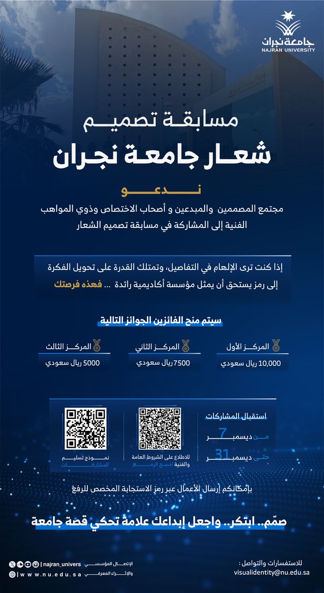 أعلنت جامعة نجران عن إطلاق مسابقة تصميم شعارها الجديد، ضمن مبادرة تهدف إلى تطوير هويتها المؤسسية بما يعكس مكانتها الأكاديمية وتطلعاتها المستقبلية، ويساهم في إبراز أصالتها وتقدمها في مجالات الابتكار والتحول الرقمي.