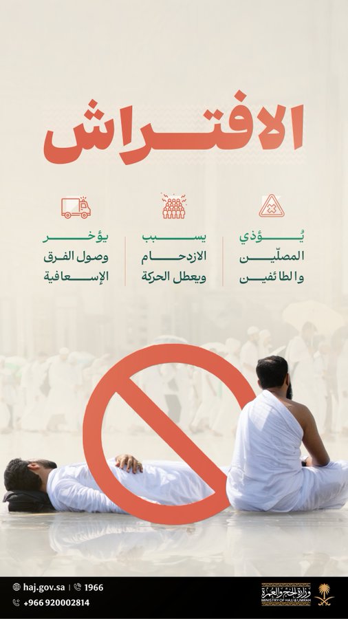 وأضافت الوزارة، عبر منصة (إكس)، أن الافتراش يؤذي المصلين والطائفين، ويتسبب في الازدحام ويعطل الحركة ويؤخر وصول الفرق الإسعافية.