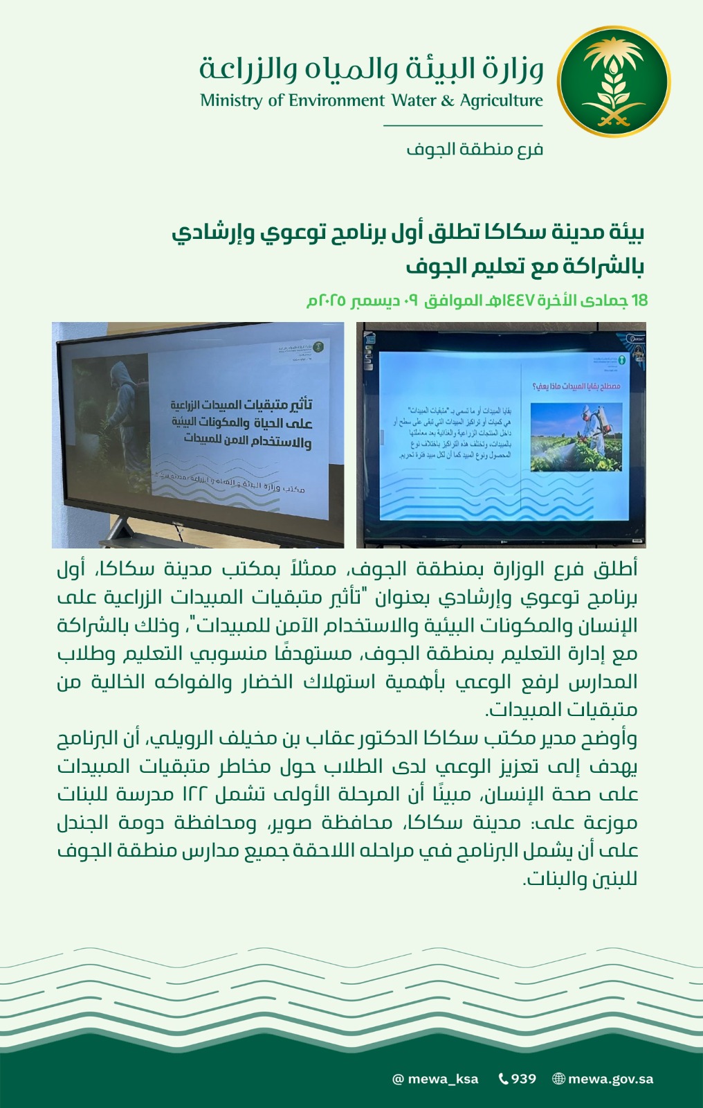 أعلن مكتب وزارة البيئة والمياه والزراعة في مدينة سكاكا عن انطلاق أول برنامج على مستوى المملكة تحت عنوان: