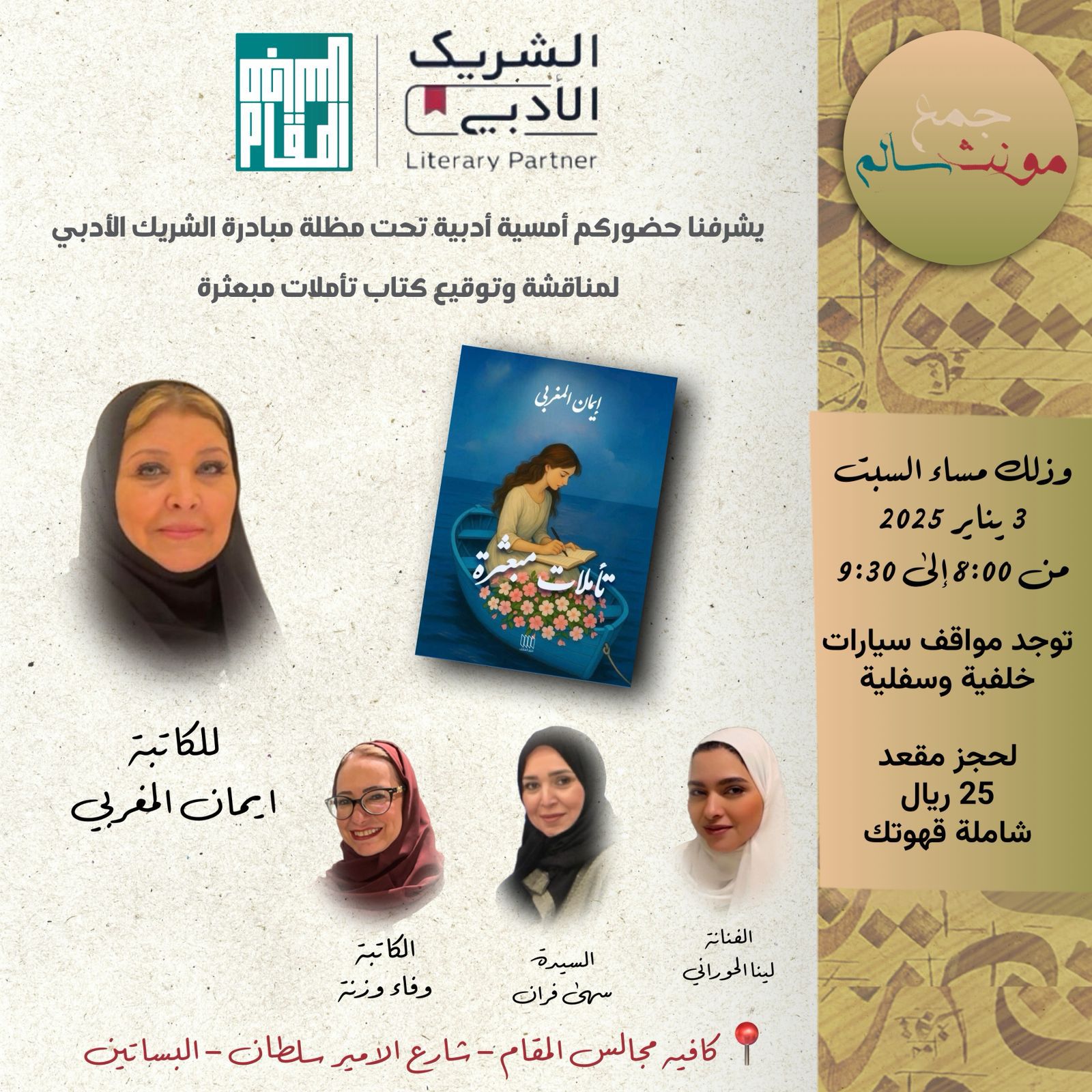 وتقام الأمسية مساء السبت 3 يناير 2025، من الساعة 8:00 حتى 9:30 مساءً، في كافيه مجلس المقام الكائن في شارع الأمير سلطان – البساتين، وسط أجواء ثقافية تفاعلية.