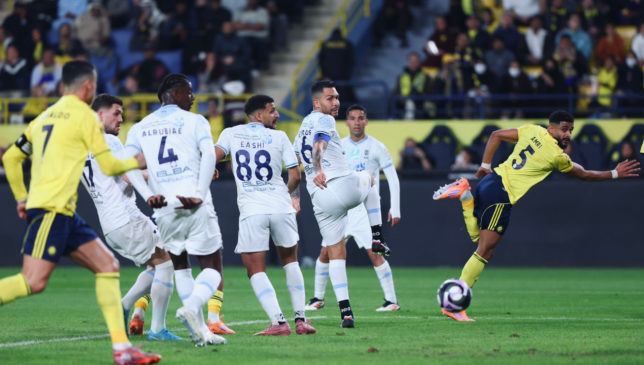 وقبل نهاية الشوط الأول، أضاف رونالدو الهدف الثاني لصالح النصر في الدقيقة الثالثة من عمر الوقت بدلًا من الضائع، بعد تمريرة من مارسيلو بروزوفيتش، داخل المنطقة وضعها النجم البرتغالي بالكعب في الشباك.