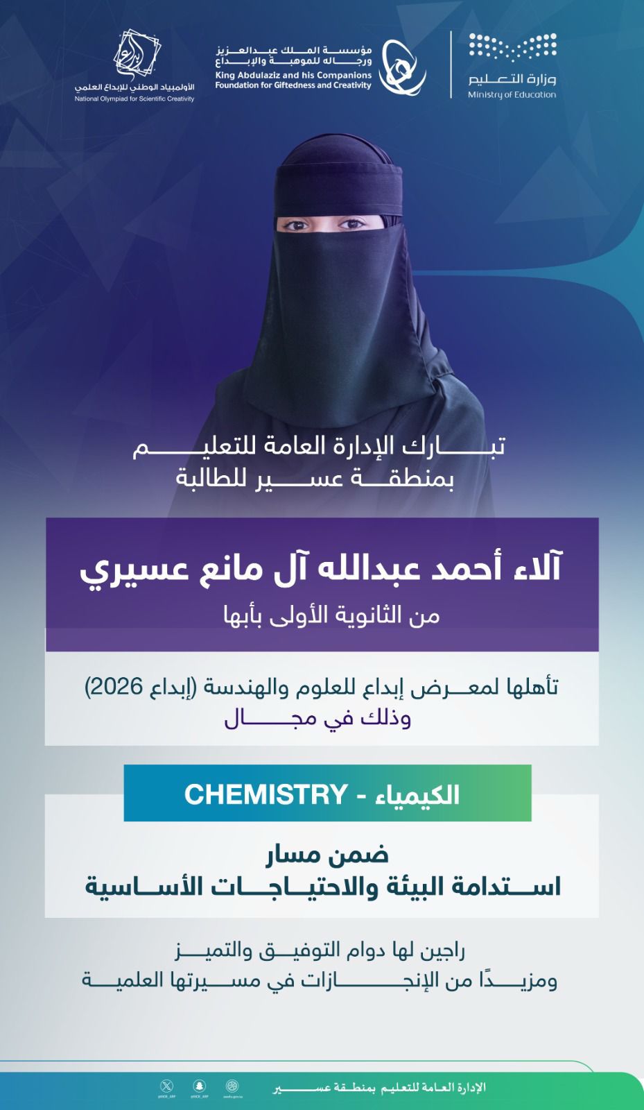 تأهلت الإدارة العامة للتعليم في منطقة عسير ممثلة في الطالبة آلاء أحمد آل مانع عسيري من الثانوية الأولى بأبها للمشاركة في معرض إبداع للعلوم والهندسة (إبداع 2026)، وذلك في مجال الكيمياء ضمن مسار استدامة البيئة والاحتياجات الأساسية.