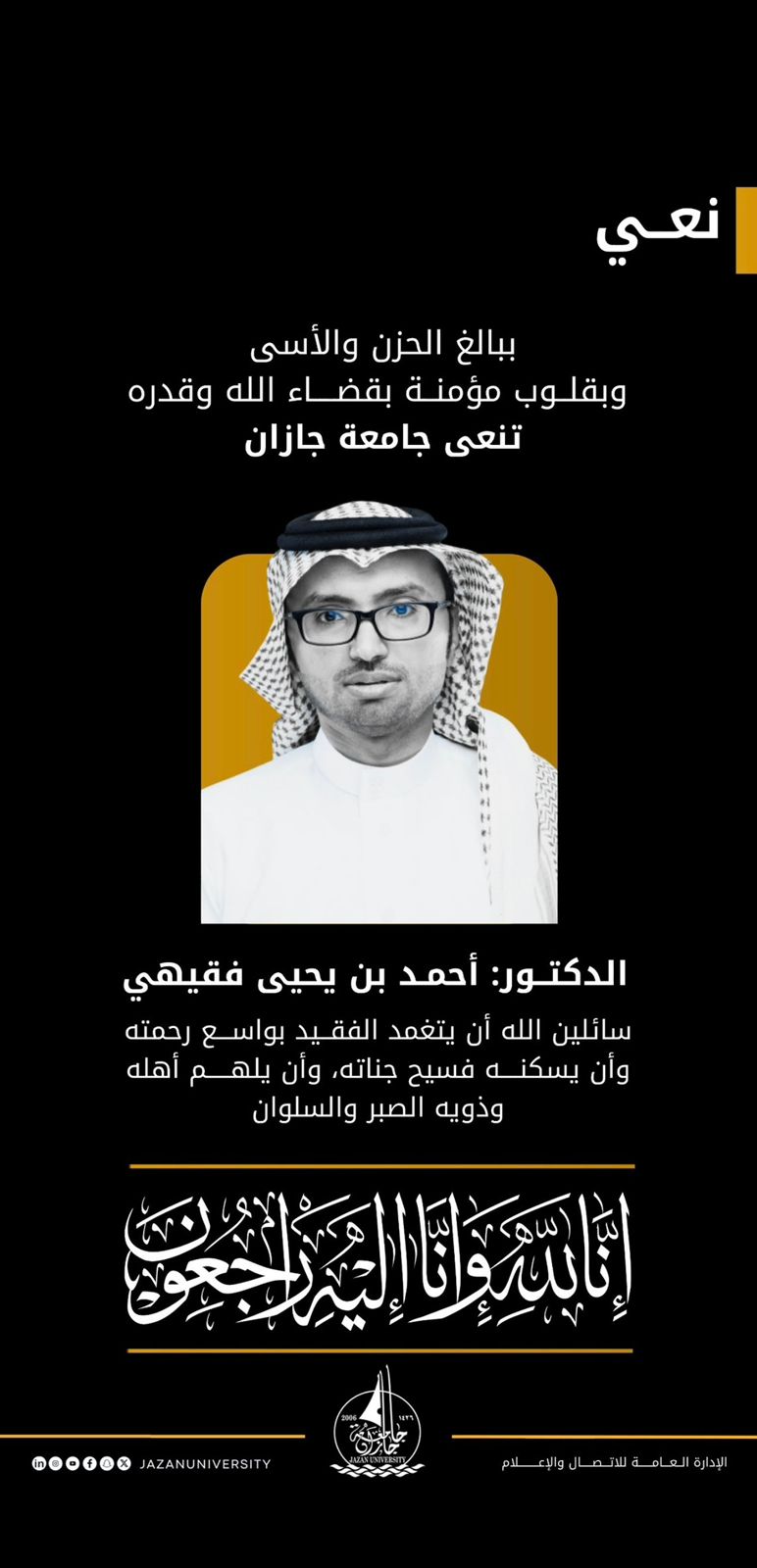 نعت جامعة جازان، ببالغ الحزن و الأسى، عميد عمادة القبول و التسجيل سابقًا، الدكتور أحمد بن يحيى محمد فقيهي ـ رحمه الله ـ ، اليوم الأربعاء 31 ديسمبر 2025 ، و هو أحد القامات الأكاديمية البارزة في الجامعة.