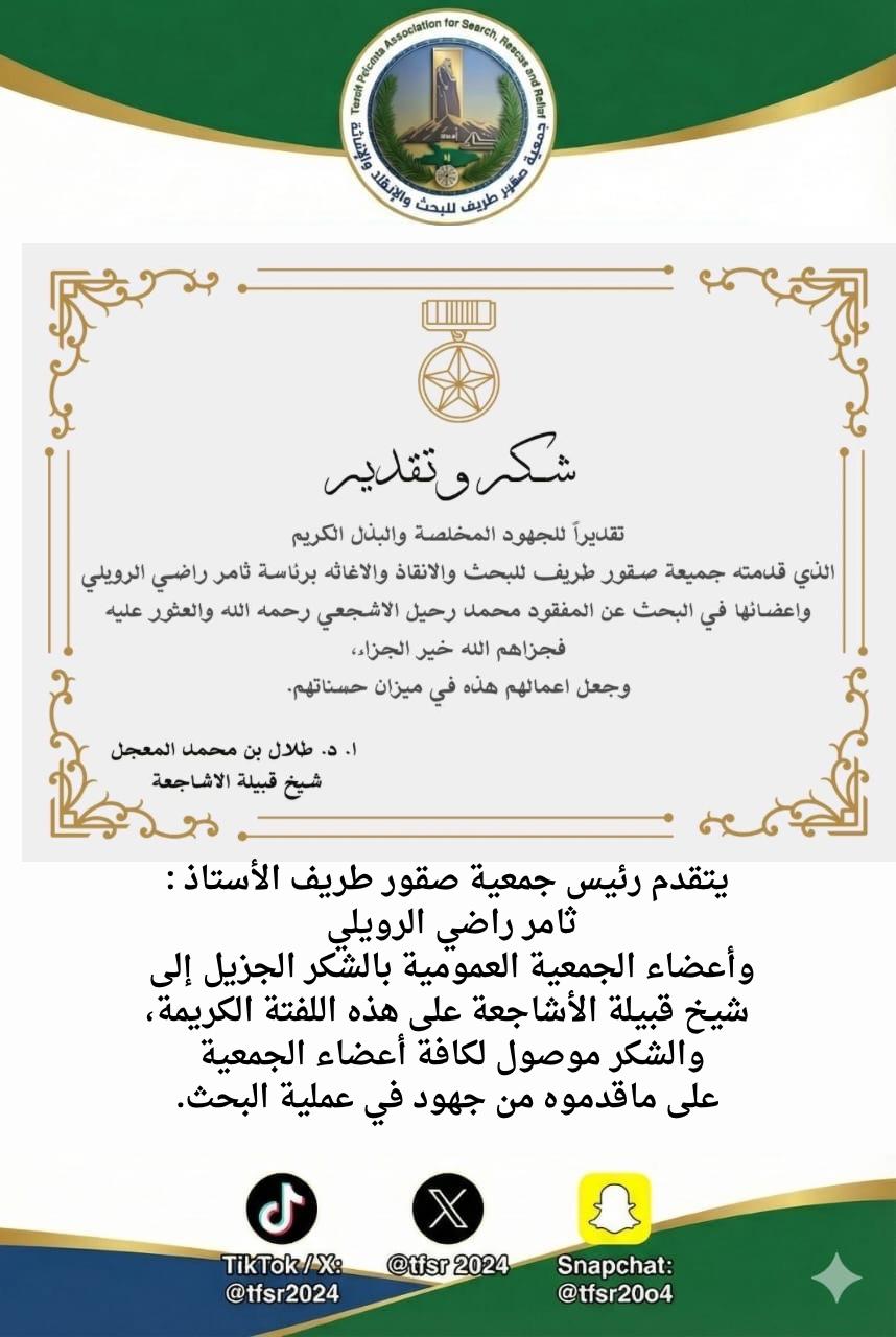 يتقدم شيخ قبيلة الأشاجعة الأستاذ الدكتور طلال بن محمد المعجل بالشكر والتقدير لجمعية صقور طريف للبحث والإنقاذ والإغاثة برئاسة الأستاذ “ثامر بن راضي الرويلي” وأعضائها.