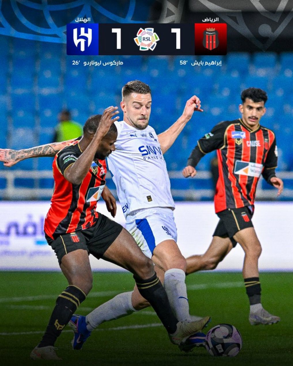 وسجل إبراهيم بايش، هدف التعادل لمصلحة الرياض بعد متابعة كرة ركنية نفذها توزي من الجانب الأيسر، وذلك خلال الدقيقة “58”.