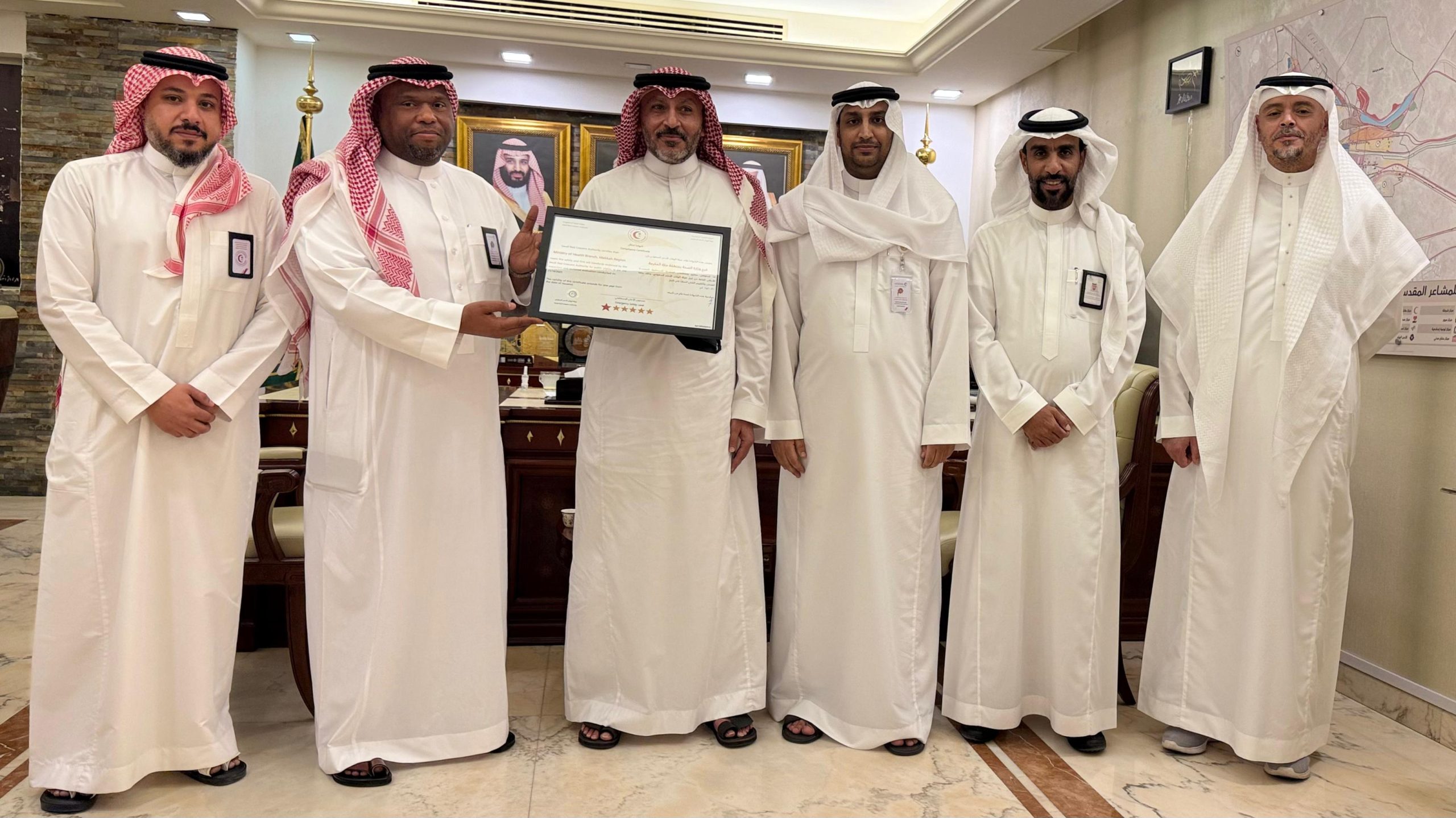 سلّم مدير عام فرع هيئة الهلال الأحمر السعودي بمنطقة مكة المكرمة، الأستاذ حسن حسين نافع شهادة الامتثال الإسعافي ضمن مشروع السلامة الإسعافية للمنشآت للدكتور وائل حمزه مطير،