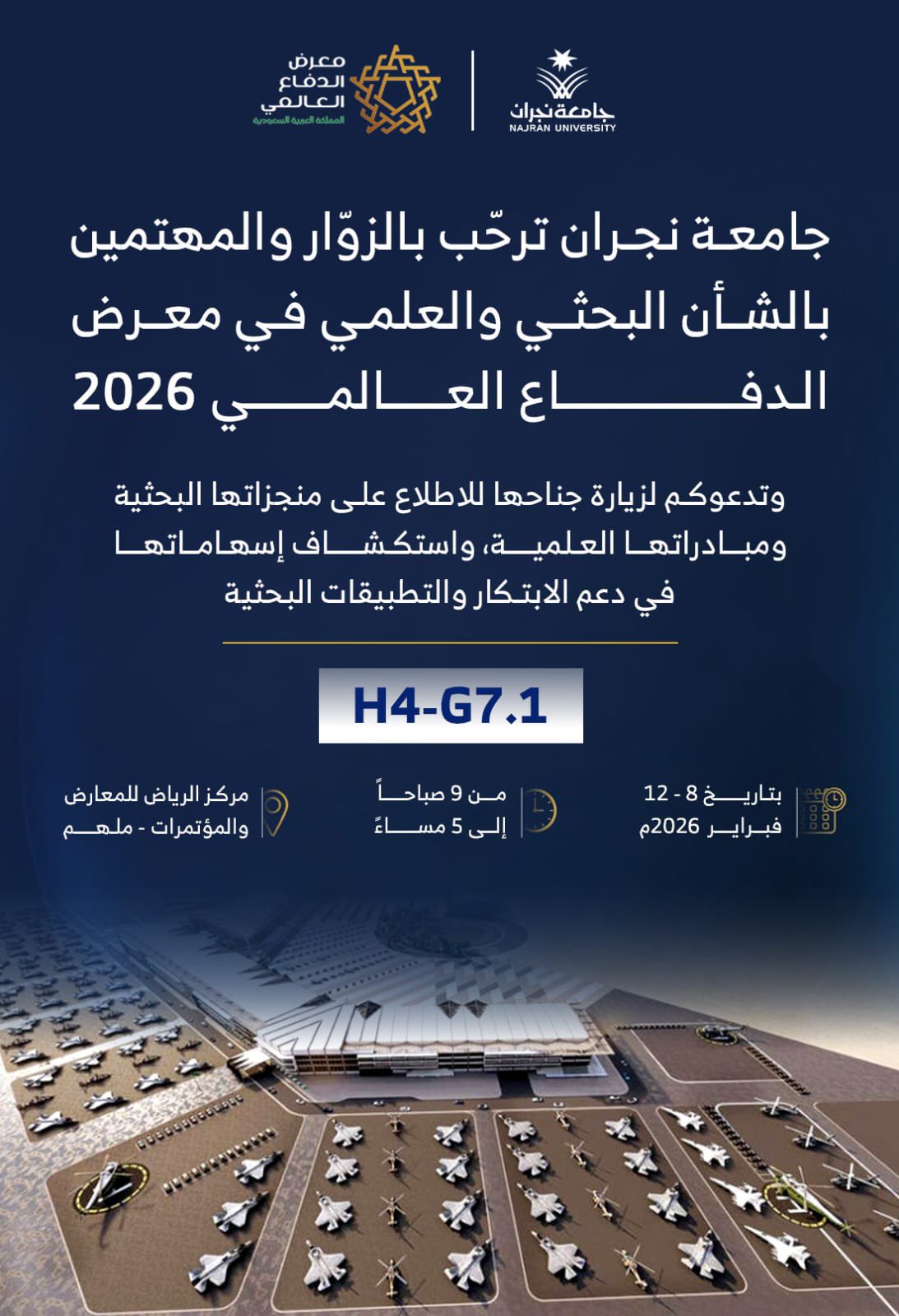 ترحّب جامعة نجران بالزوّار والمهتمين بالشأن البحثي والعلمي، وذلك من خلال مشاركتها في معرض الدفاع العالمي 2026، حيث تدعو الجميع لزيارة جناحها والاطلاع على أبرز منجزاتها البحثية ومبادراتها العلمية.